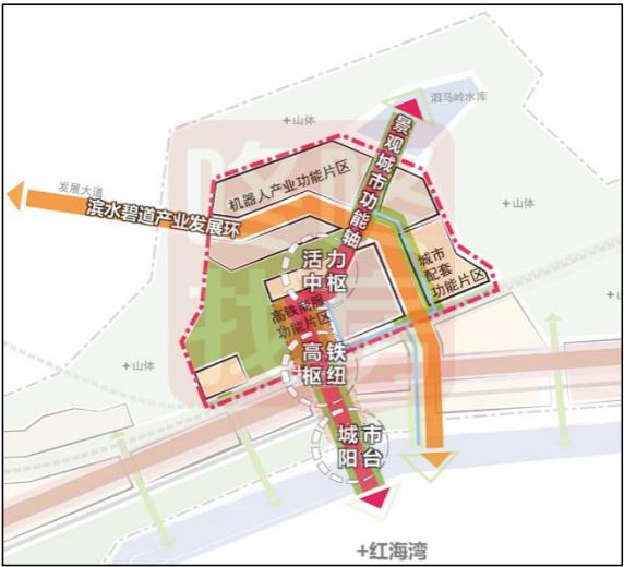 发展目标:对标国际一流,打造山水交融、创新引领、产城融合 的活力智谷,成为带动沿海经济带与深汕特别合作区滨海创新产业带发展的核心 引擎。