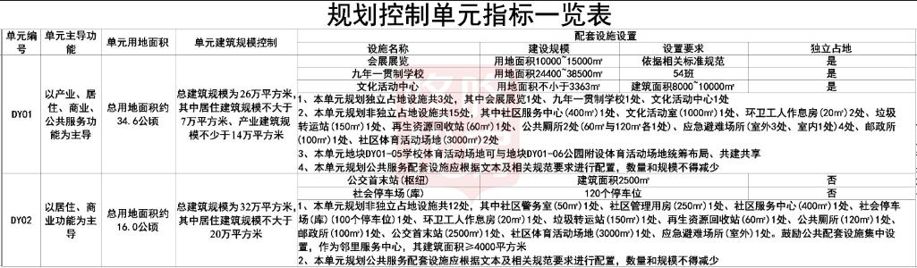 单元 01 内独立占地配套设施包括:文化活动中心 1 处(DY01-09)、会展 展览 1 处(DY01-19)、54 班九年一贯制学校 1 处(DY01-05,学校体育活动场 地可与地块 DY01-06 公园附设体育活动场地统筹布局、共建共享,地块 DY01-06 需结合学校布局、为学校提供人行或机动车出入口)。