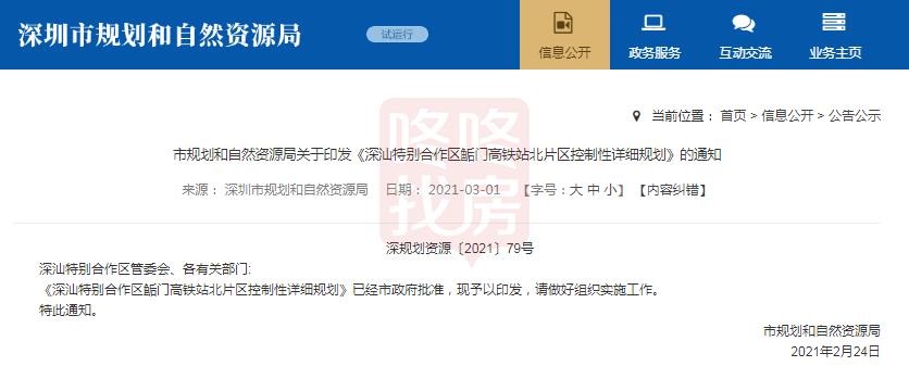 3月1日,深圳市规划和自然资源局发布《深汕特别合作区鲘门高铁站北片区控制性详细规划》。
