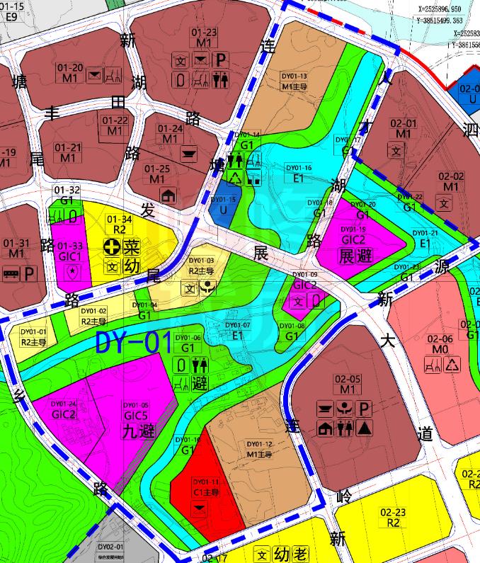 单元 01 由新乡路、连塘尾路、泗马岭路、人才湖路、泗马岭河、新源路、 连新路、新岭路围合而成,包括 DY01-01~DY01-24 共 24 块地块,以产业、居住、 商业、公共服务功能为主导。单元依托泗马岭水库、新乡河、大水坑水蓝绿廊道, 重点打造人才湖公园、博览公园,沿线设置文化活动中心、会展中心、图书馆、 艺术馆等服务配套,提供一定的产业、居住、商业功能,塑造活力公园之城。