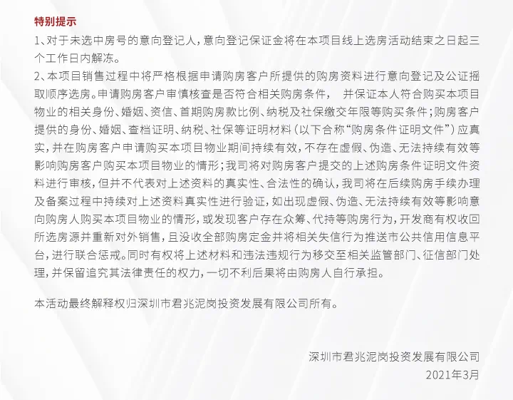 项目将于3月8日在前海公证处公证摇取选房顺序号,3月10日公证选房。