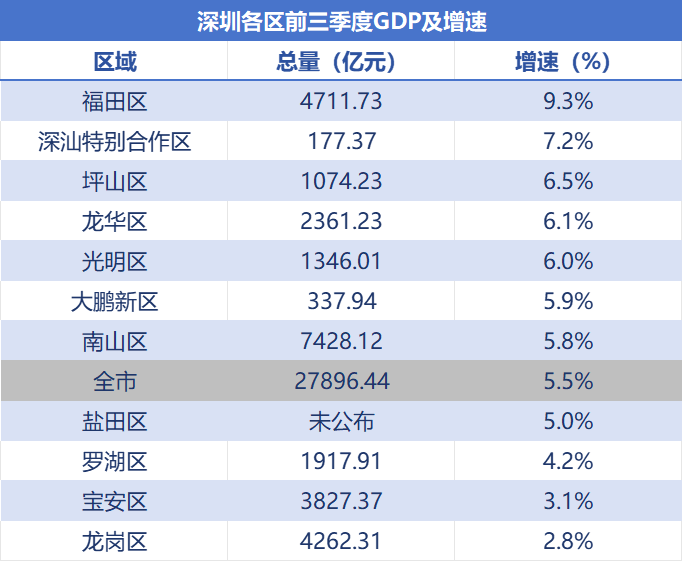 前不久,深圳发布2025年前三季度经济数据,全市地区生产总值27896.44亿元、同比增长5.5%。近期,各区前三季度经济数据也陆续出炉。