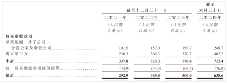 截至2024年6月30日,深业物业贸易应收款约为7亿元,其中关联方占比35.01%,第三方占比64.9%;期内减值拨备约7680万元,贸易应收款余额6.35亿元。