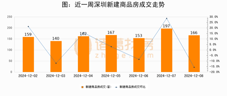 根据深圳市住房和城乡建设局数据显示,2024年12月08日深圳新建商品房成交166套,较昨日减少31套,环比下降15.7%
