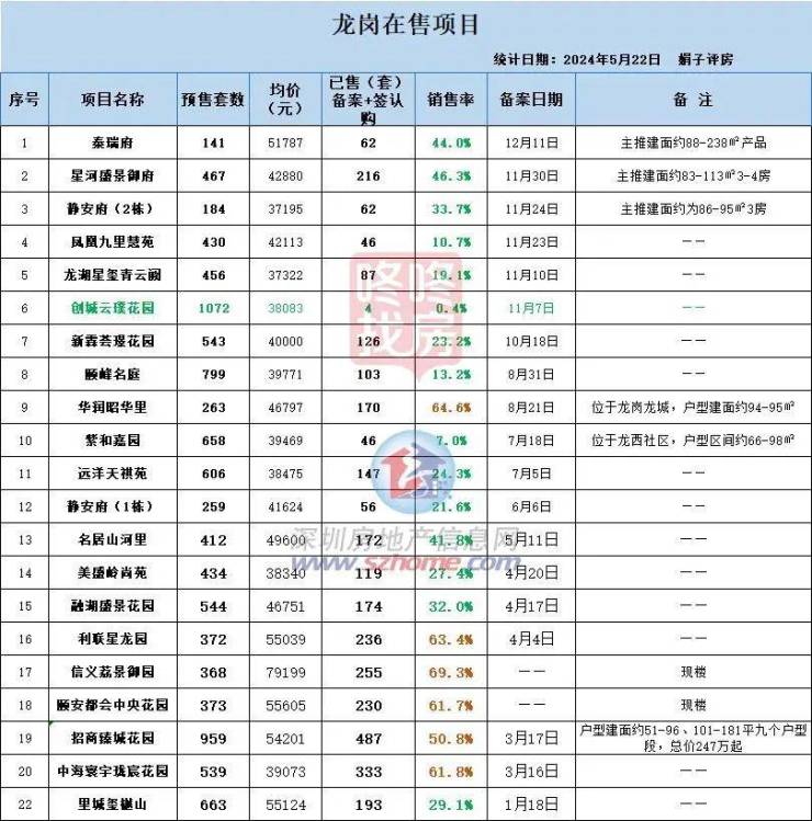 龙岗片区目前在售的盘,也主要是2023年入市的新盘为主,2023年之前入市的项目目前大部分去化得差不多,剩下的主要是位置和价格优势不明显的住宅盘,以及公寓产品。