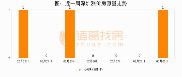 根据诸葛找房数据显示,深圳24小时涨价房源量为1套,较02月28日增加1套,环比上涨0%。与此同时,涨价房源占比小幅扩大,业主信心有所提升。