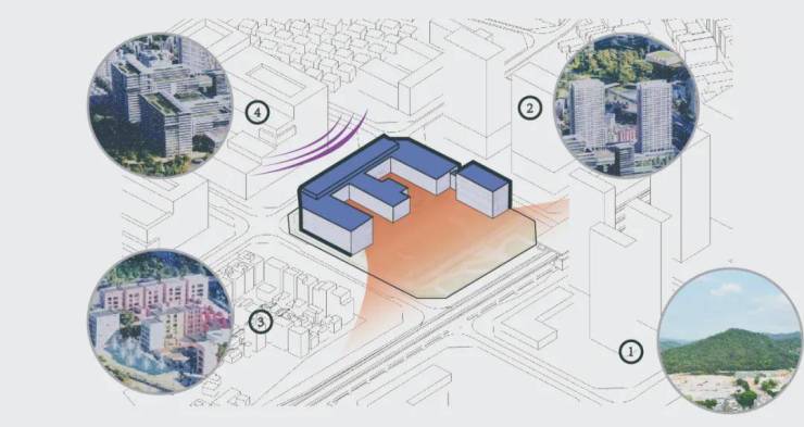 项目场地有三个特点:三面高层围堵,东侧具有明确的开放和生态性。西南侧连续的城市公共空间和慢行体系,与场地贴临。场地现状为厚覆土层与道路存在4米的高差。