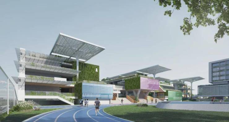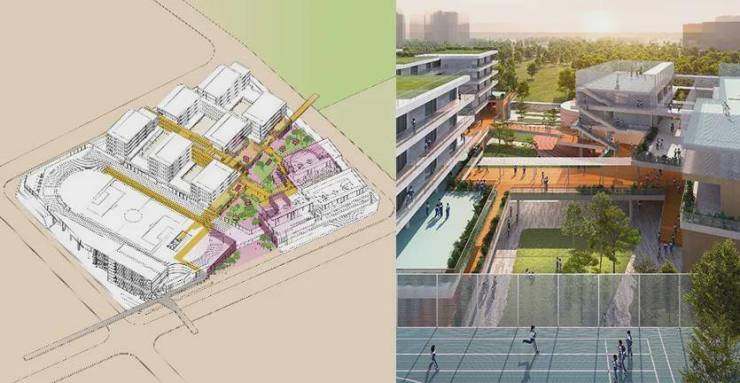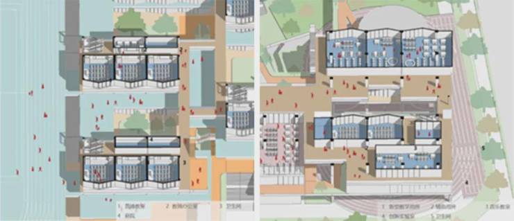 学校主要教学空间及操场架空抬升,底层灰空间内外、公私合理分区,部分区域向城市打开,校园可充分链接城市公园绿廊,社区也有效共享校园体育运动、报告厅等校园设施。
