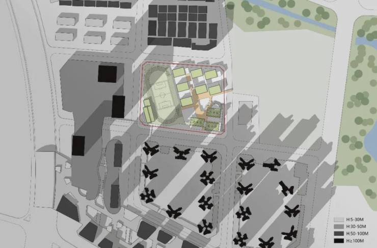 300米运动场布置于西侧,减弱超高层综合体对校园的压迫感;