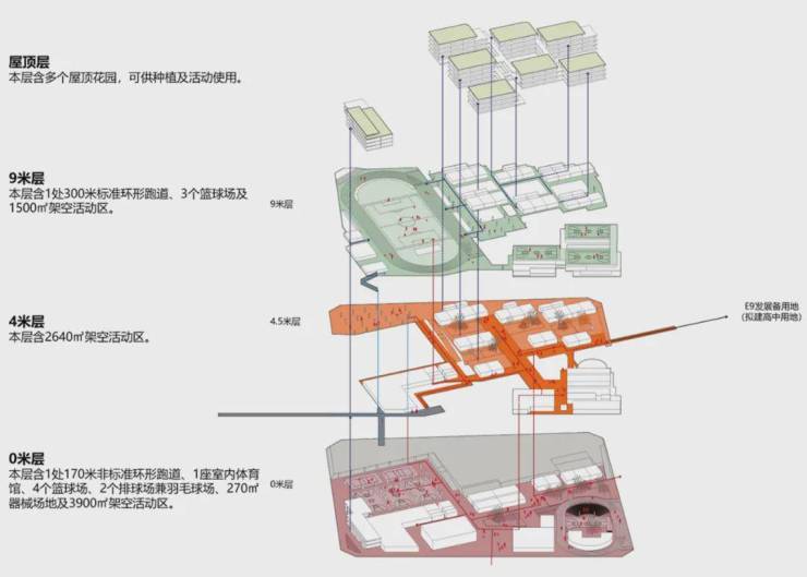 设计利用场地的4米高差,形成了0米,4米,9米的三层地表,创造了大量的体育运动,课间活动的场地,以及架空活动场地,满足各类教学活动需求。
