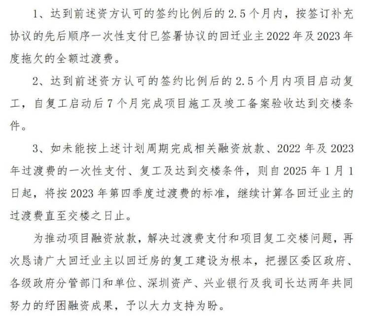 为了推进项目盘活及复工交楼,要先解决当前困难,“项目的过渡费金额持续增加,融资额度无法覆盖全额过渡费支出及逾期交楼的违约金等”,因此向回迁业主提出3点诉求: