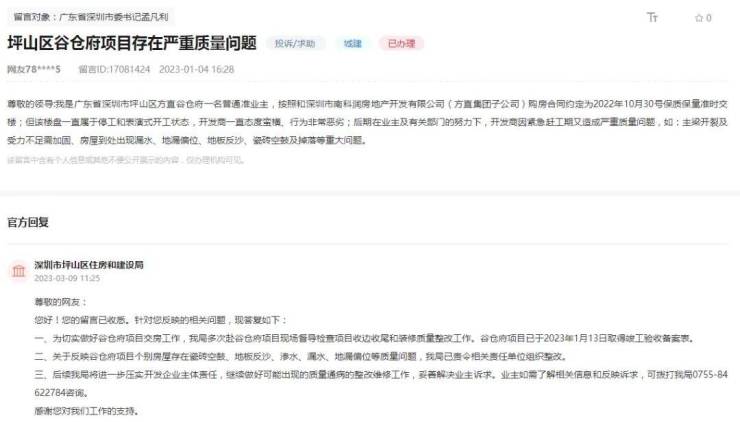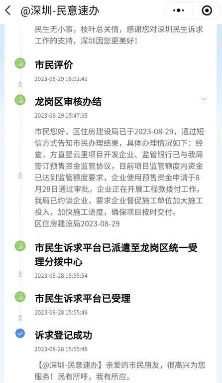 @武神安居 公众号曾发文,有网友购买了方直云星里后发现楼盘现场没什么动静,有停工嫌疑。随后该网友咨询了龙岗有关部门,得到答复称会督促项目施工,确保按时交付。希望业主们届时能圆满收房。