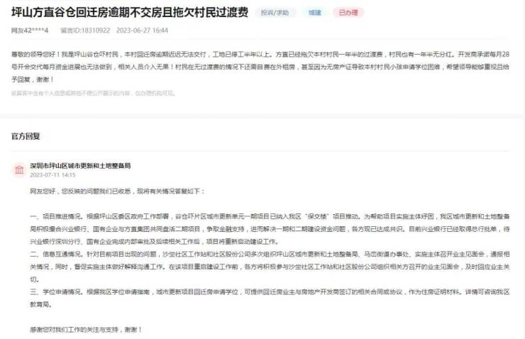 回迁业主曾在领导留言板反馈开发商不交房且拖欠过渡费的问题,甚至影响适龄儿童入学。