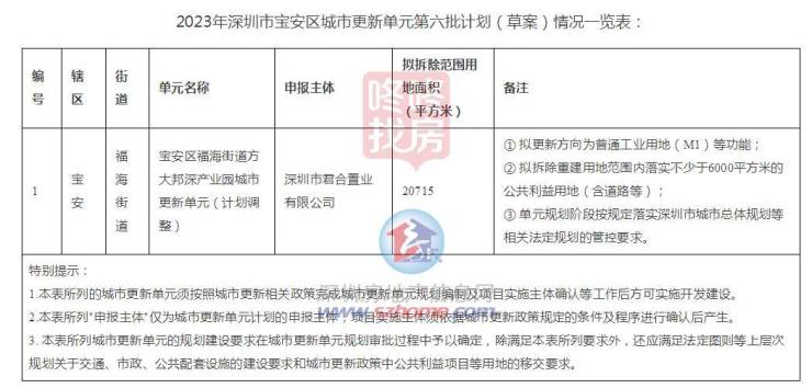项目申报主体是深圳市君合置业有限公司。该项目已于2019年7月30日列入《宝安区2019年城市更新单元计划第五批计划》,此次计划调整,不涉及更新方向、拆除范围调整、计划申报主体调整。