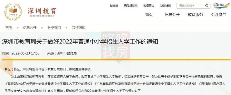 5月23日,深圳市教育局发布《关于做好2022年普通中小学招生入学工作的通知》(以下简称通知)。