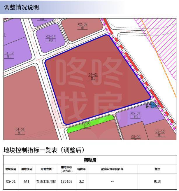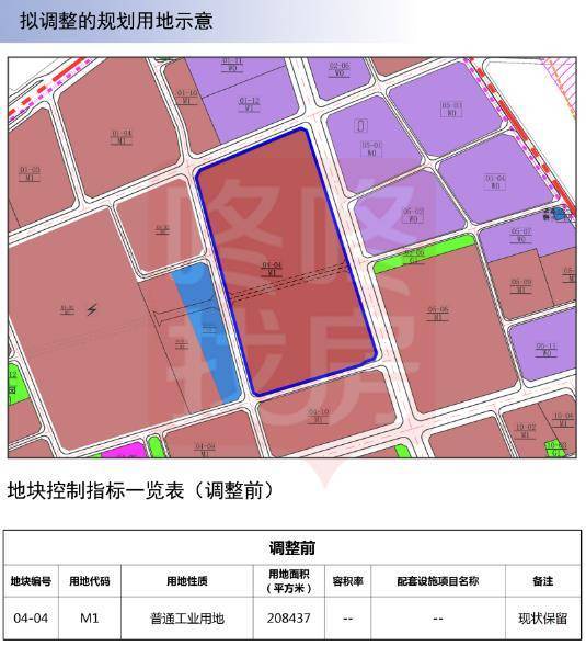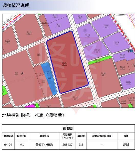 规划调整情况:将04-04地块容积率调整为3.2,用地性质保持普通工业用地(M1)不变,并取消原规划的建议性支路,备注:规划。