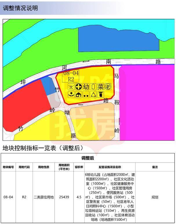 调整后,08-04地块规划用地性质调整为二类居住用地,用地面积为25439㎡,容积率4.5,配套6班幼儿园(占地面积2000㎡,建筑面积2200㎡)、社区文化活动室(1000㎡)、社区健康服务中心(1500㎡)、社区管理用房(250㎡)、便民服务站(500㎡)、社区菜市场(500㎡)、社区警务室(50㎡)、社区老年人日间照料中心(1500㎡)、小型垃圾转运站(150㎡)、再生资源回收站(100㎡)、社区体育活动场地(场地面积1500㎡),备注:规划。