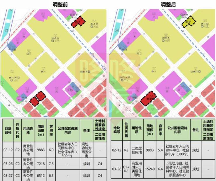 ● 03-26规划、03-27地块原规划为商业性办公用地,合并为03-26地块后,调整为商业用地+二类居住用地,容积率6.4。