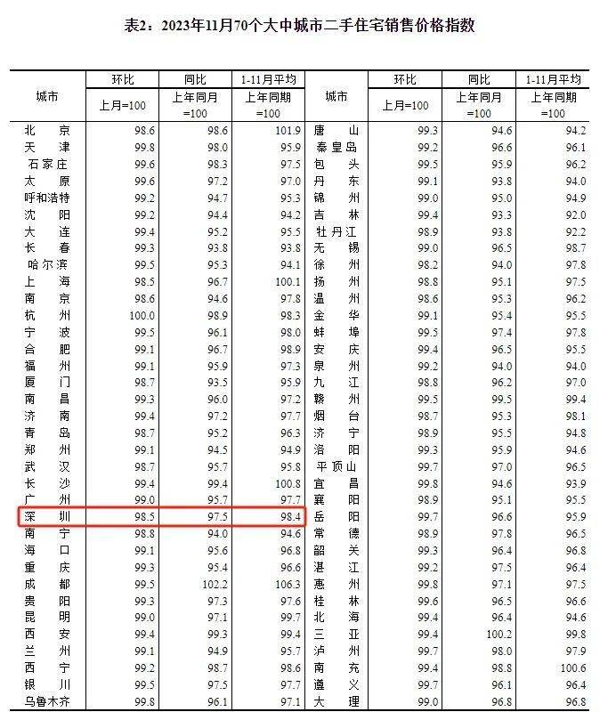 从同比看,11月份,一线城市二手住宅销售价格同比下降2.9%,其中,北京、上海、广州和深圳同比分别下降1.4%、3.3%、4.3%和2.5%。