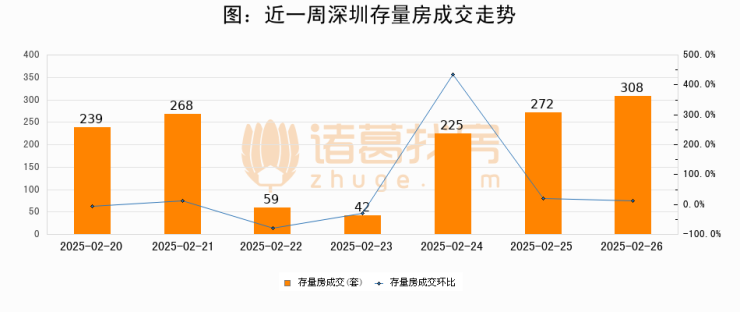 从存量房来看,2025年02月26日深圳存量房单日成交308套,比昨日增加36套,环比上涨13.2%。从近一周存量房成交来看,深圳存量房日均成交套数为201套,02月26日单日成交308套,高于近一周平均水平53.2%。