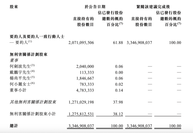 截至公告日期,五矿地产已发行3,346,908,037股股份,无利害关系计划股东持有1,275,812,531股股份(占已发行股份约38.1 2%);要约人持有2,071,095,506股股份(占已发行股份约61.88%)。