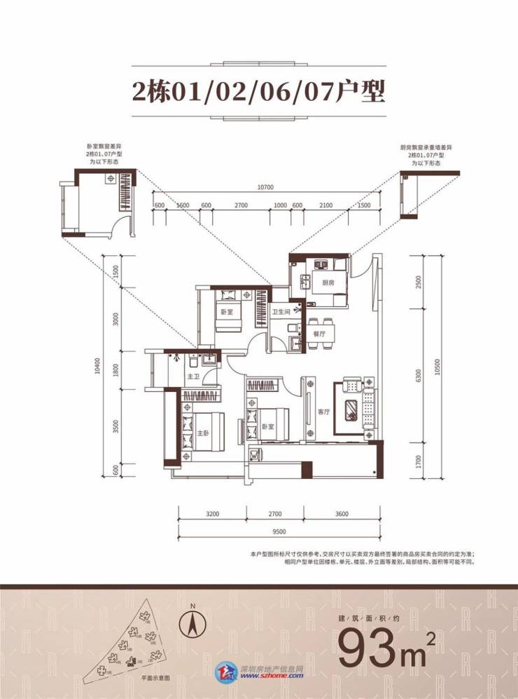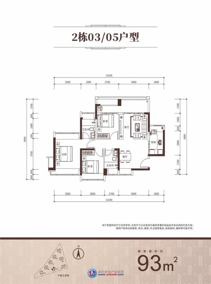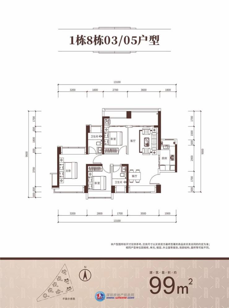 93㎡户型分布在2栋,99㎡户型分布在1、8栋,格局相同,主要空间尺寸差别不大。