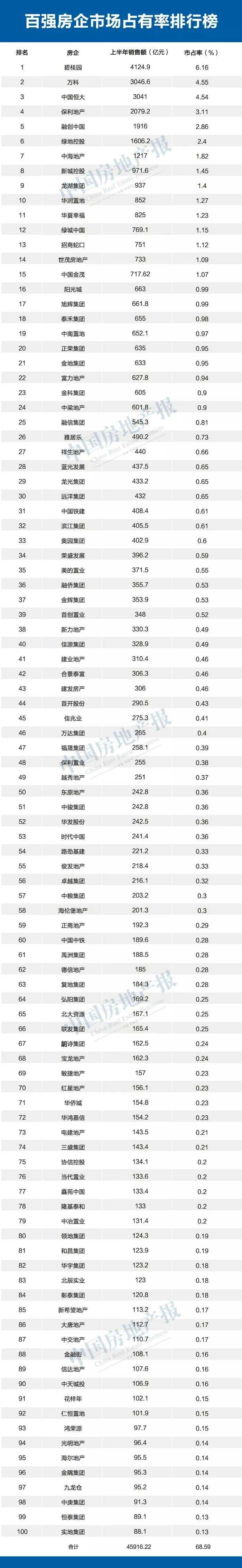 中国房地产报记者特别发布的上半年百强房企市场占有率排行榜显示,今年上半年百强房企全国市场占有率高达68.59%,即全国新房市场近7成的份额被集中在百强房企手中。而这一数字在2003年仅14%,2017年为47.7%。