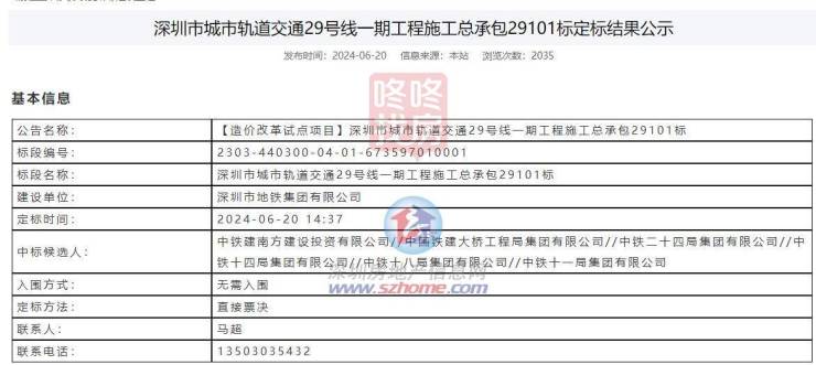6月20日,地铁29号线一期工程施工总承包29101标定标结果公示。