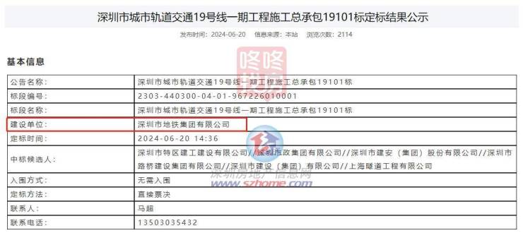 深圳市地铁集团有限公司发布深圳市城市轨道交通19号线一期工程施工总承包19101标中标结果。