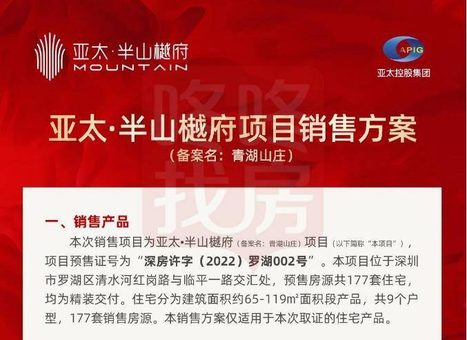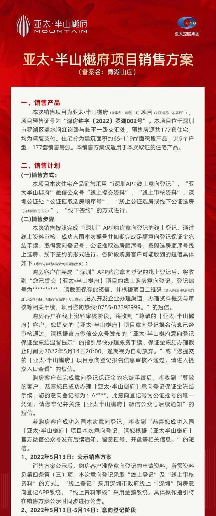 5月12日,位于罗湖的亚太·半山樾府(青湖山庄)获批预售,5月13日5:00,销售方案公布。