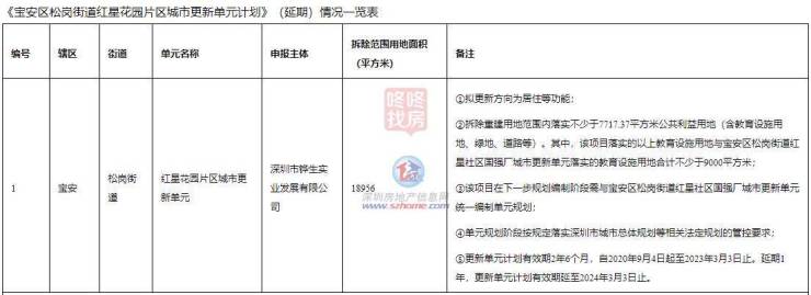 据公布显示,《宝安区松岗街道红星花园片区城市更新单元计划》在原计划有效期基础上延期一年,有效期延至2024年3月3日止。