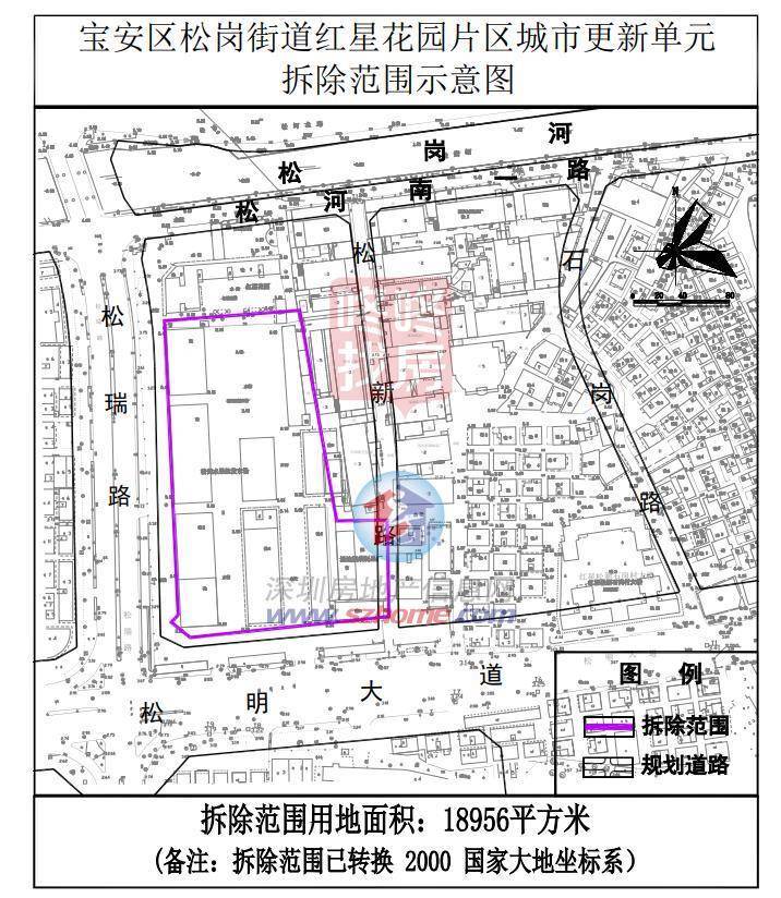 红星花园片区城市更新单元位于宝安区松岗街道松瑞路与松明大道交汇处东北侧,拟拆除范围用地面积18956平方米,申报主体为深圳市铧生实业发展有限公司。