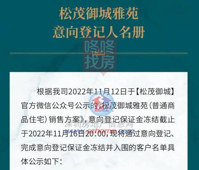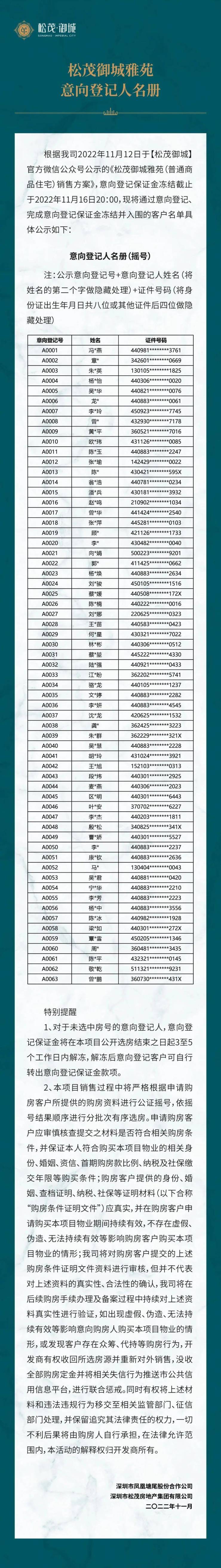 11月17日,松茂御城雅苑登记人名册公示,共有63批客成功意向登记。