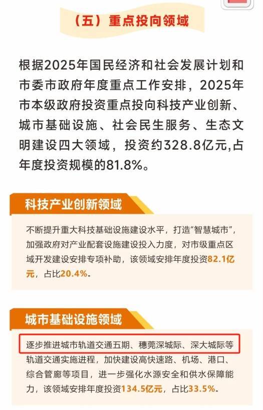 城市基础设施领域逐步推进城市轨道交通五期、穗莞深城际、深大城际等轨道交通实施进程,加快建设高快速路、机场、港口、综合管廊等项目,进一步强化水源安全和供水保障能力,该领域安排年度投资134.5亿元,占比33.5%;