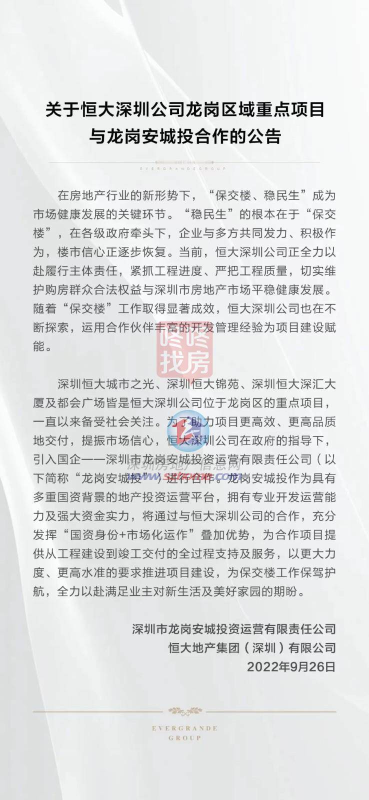 9月27日,恒大发布公告称,深圳龙岗区重点项目(深圳恒大城市之光、深圳恒大锦苑、深圳恒大深汇大厦及都会广场等重点项目与龙岗安城投合作。