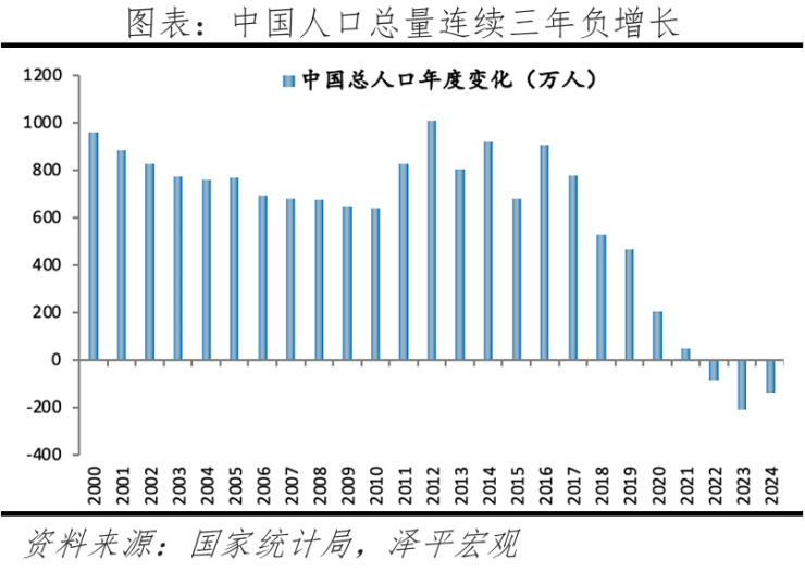 人口持续减少,2024年末全国人口140828万人,比上年末减少139万人,中国总人口已连续3年负增长。根据育娲人口《中国人口预测报告2023》,如果没有实质有效的鼓励生育政策出台,生育率下降趋势难以扭转,2050年中国总人口将下降至11.7亿,2100年中国人口将降到4.8亿,占世界人口比例将从现在的17%降至4.8%。