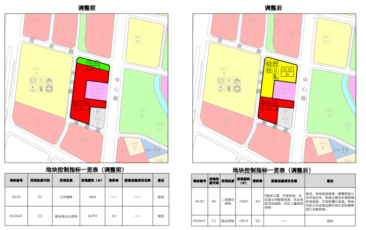 05-03地块规划用地性质调整为二类居住用地(R2),用地面积19247平方米,容积率“4.0”,配套设施项目为“9班幼儿园、托育机构、社区级公共配套用房、社区体育活动场地、社区儿童游戏场地”,备注“规划,地块临迎宾路一侧需预留公共开放空间,衔接北侧及东侧绿地,形成连续、开放的慢行系统。地块内的公共设施远期可结合实际需要进行功能转换”。