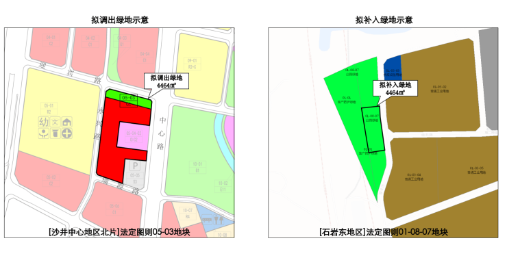 原05-03地块规划公共绿地4464平方米,减少的公共绿地在[石岩东地区]法定图则01-08-07地块中补充,确保宝安区规划绿地总量不减少。