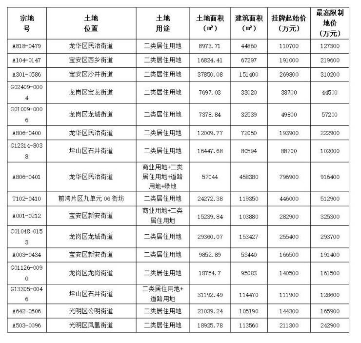 地块位置涵盖前海深港现代服务业合作区(1宗)、宝安区(4宗)、龙华区(3宗)、光明区(2宗)、龙岗区(4宗)、坪山区(2宗)共6区。