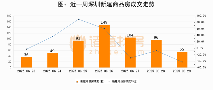 根据深圳市住房和城乡建设局数据显示,2025年06月29日深圳新建商品房成交55套,较昨日减少41套,环比下降42.7%。近一周深圳新建商品房日均成交84套。06月29日单日成交55套,低于近一周平均水平34.5%。