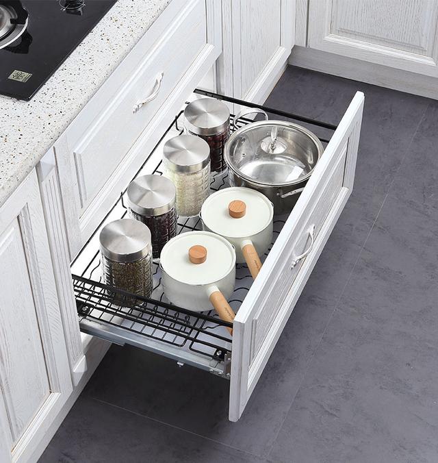 买一个拉篮最实用了,一种放碗一种放锅的,但是不要连在门板上时间长了门就变型了,切记切记...