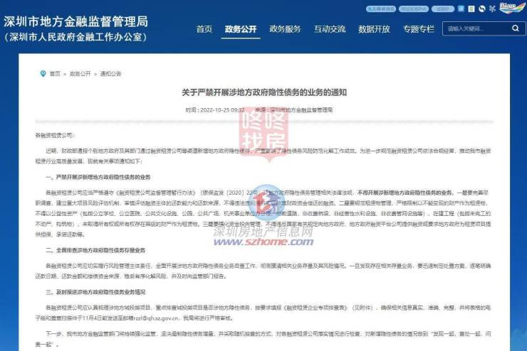 10月25日,深圳市地方金融监督管理局发布关于严禁开展涉地方政府隐性债务的业务的通知。
