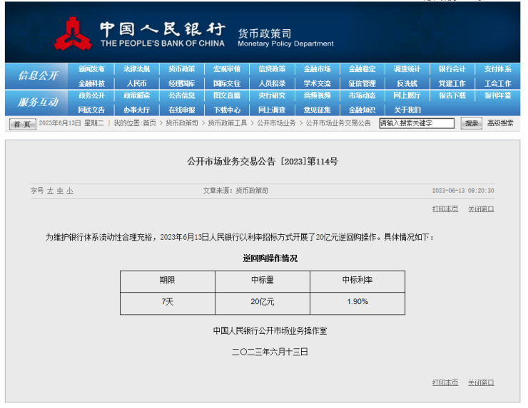 6月13日,中国人民银行发出公告,为维护银行体系流动性合理充裕,6月13日人民银行以利率招标方式开展了20亿元7天期逆回购操作,中标利率为1.90%,较上一交易日中标利率下降10个基点,为去年8月中旬以来首次下调。