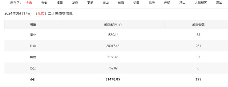 2024年6月17日二手房住宅网签281套。宝安37套;福田52套;龙岗73套;罗湖42套;南山46套;盐田4套;龙华14套;光明5套;坪山8套;大鹏0套。
