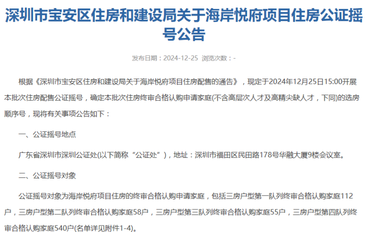 宝安可售人才住房海岸悦府公示公证公告,项目终审合格认购申请家庭共772户,397套房源即将选房。