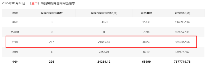 2025年1月16日新房购房合同网签217套。其中,宝安73套;福田5套;龙岗37套;罗湖5套;南山1套;盐田5套;龙华40套;坪山11套;光明40套;大鹏0套;深汕0套。