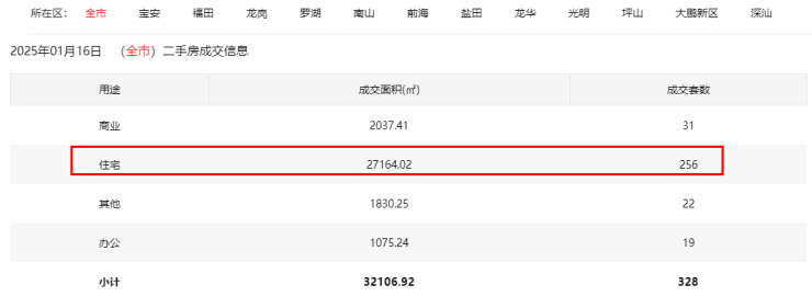 2025年1月16日二手房住宅网签256套。其中,宝安34套;福田44套;龙岗59套;罗湖39套;南山37套;盐田3套;龙华22套;坪山8套;光明8套;大鹏2套。