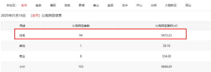 2025年1月16日新房住宅认购网签94套。其中,宝安32套;福田0套;龙岗29套;罗湖2套;南山5套;盐田2套;龙华13套;坪山4套;光明6套;大鹏1套;深汕0套。