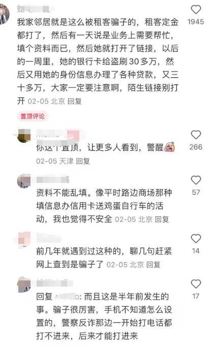 有网友表示自己的邻居就是这么被骗的,打定金后,说有业务需要帮忙,填个资料而已,然后打开链接,再后来银行卡被盗刷了30多万,还用她的身份信息办理了各种贷款。