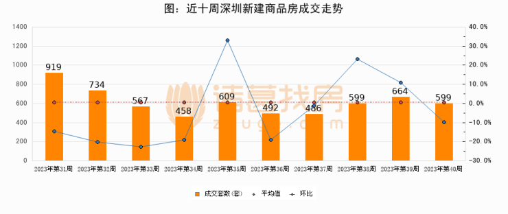 进入2023年第40周(09月25日-10月01日),深圳新建商品房成交599套,较上周减少65套,环比下降9.8%